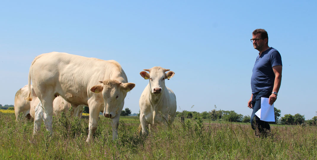 Nach einem hervorragenden Mittagessen in der eigenen Gaststätte der Familie Meetz, ging es zu den einzelnen Weiden, die teilweise bis an die Ostsee reichen. Zur Bewirtschaftung der extensiven Grünlandflächen stehen dem Betrieb neun Blonde d‘ Aquitaine-Zuchtkühe samt Deckbullen und Nachtzucht sowie einzelne Kreuzungskühe zur Verfügung. Außerdem betreut Matthias Meetz mit einem Partner eine Gallowayherde auf weiteren Naturschutzflächen.